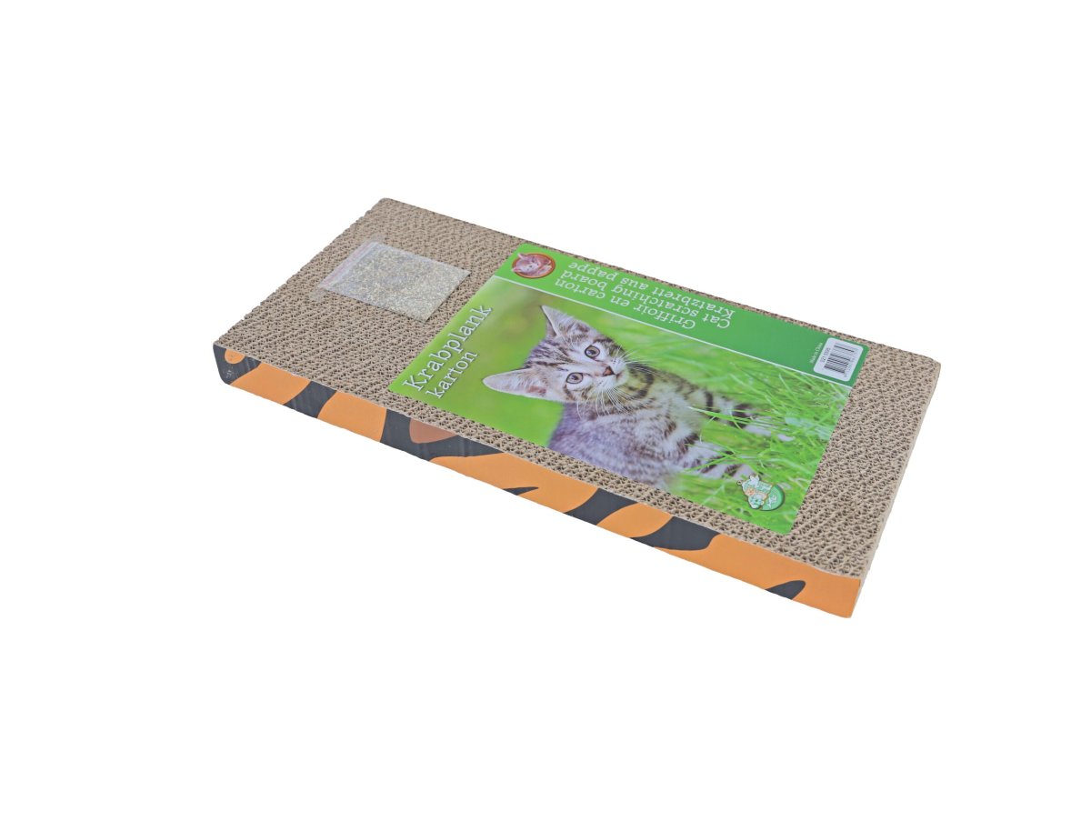 Deze krabplank is gemaakt van karton en word geleverd met een zakje catnip.