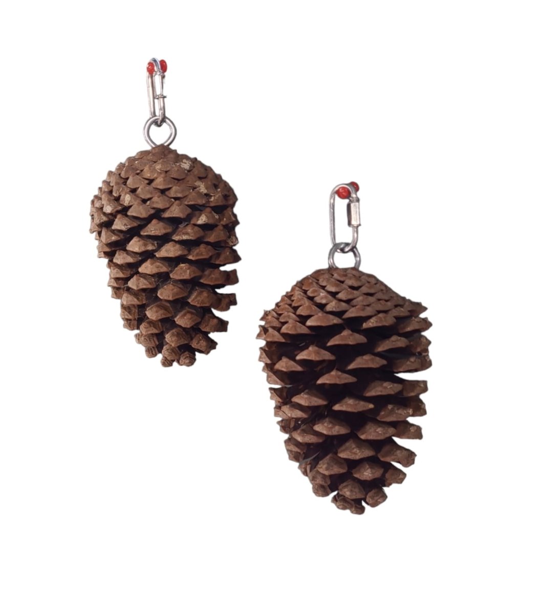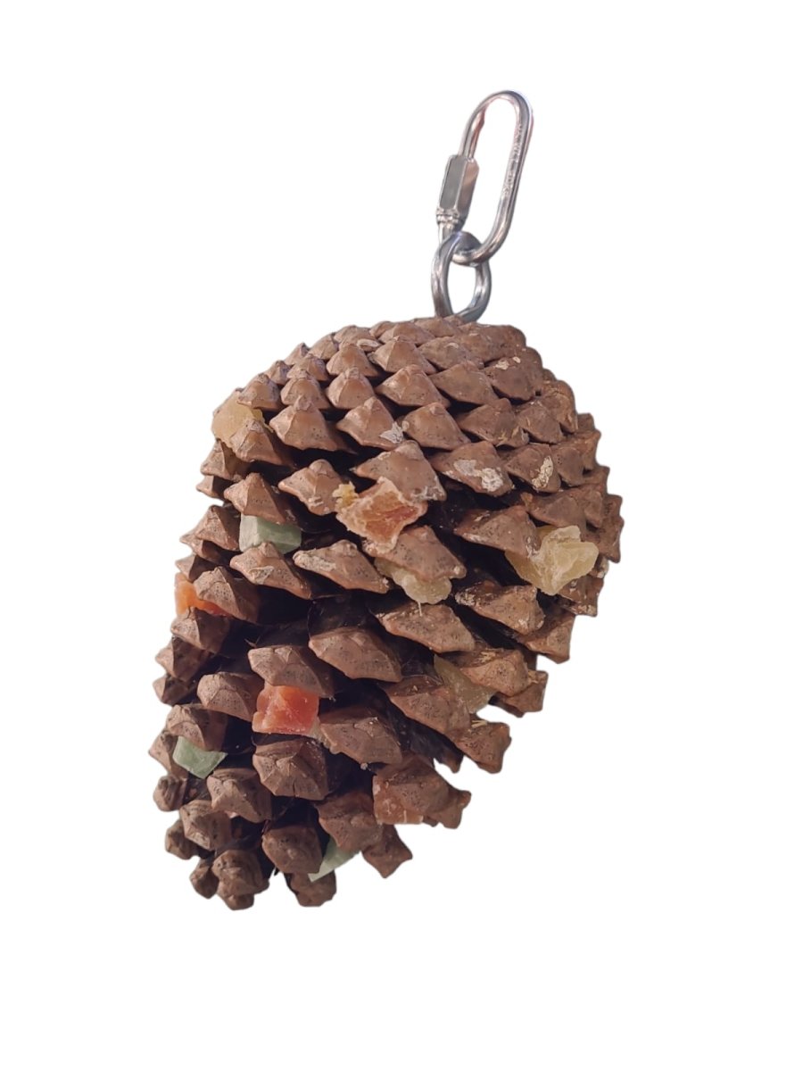 PUUR NATUUR denneappel, op te hangen in de kooi. De dennenappel zelf is +/- 13 cm, voorzien van oogje met quicklink.