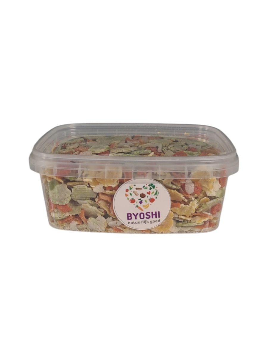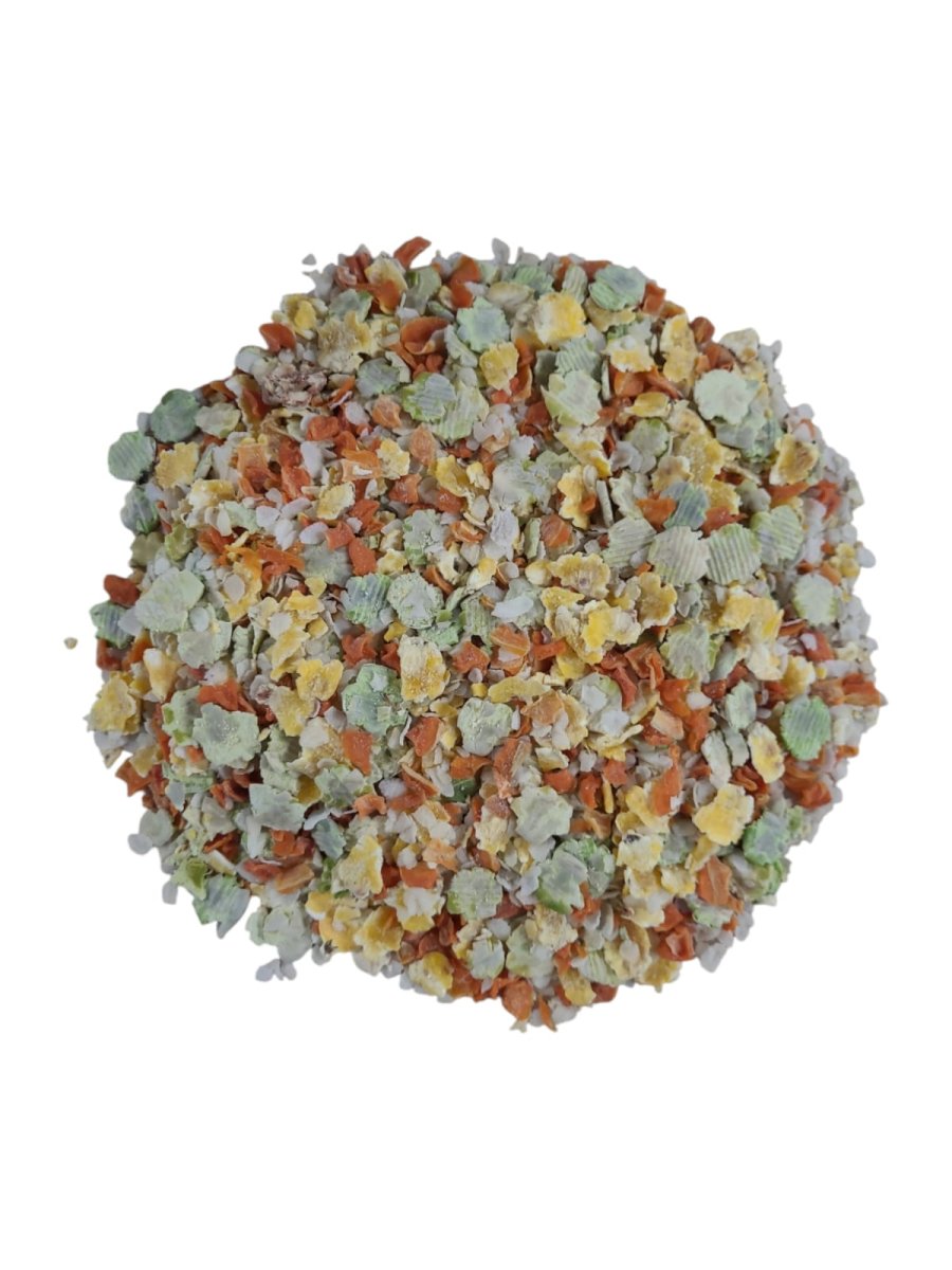 Ingrediënten: wortelstukjes(25%), erwtenvlokken(25%), rijstvlokken (25%) en maisvlokken(25%).
