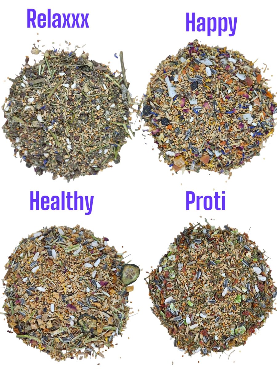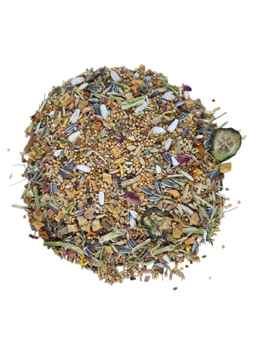 Ingrediënten: Tarwe, witzaad, zonnebloempitten, gepunte en gepelde haver, boekweit, lijnzaad, paddy, kardi, dari, hennep, peterseliestengels, luzerne, goudsbloemknoppen, kamille, rozenblad, zoete aardappelstukjes, komkommerschijfjes.