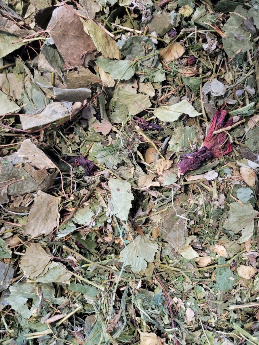 Ingrediënten: peterseliestengels, bananenchips, berkenblad, frambozenblad, paardenbloem, luzerne, hibiscus