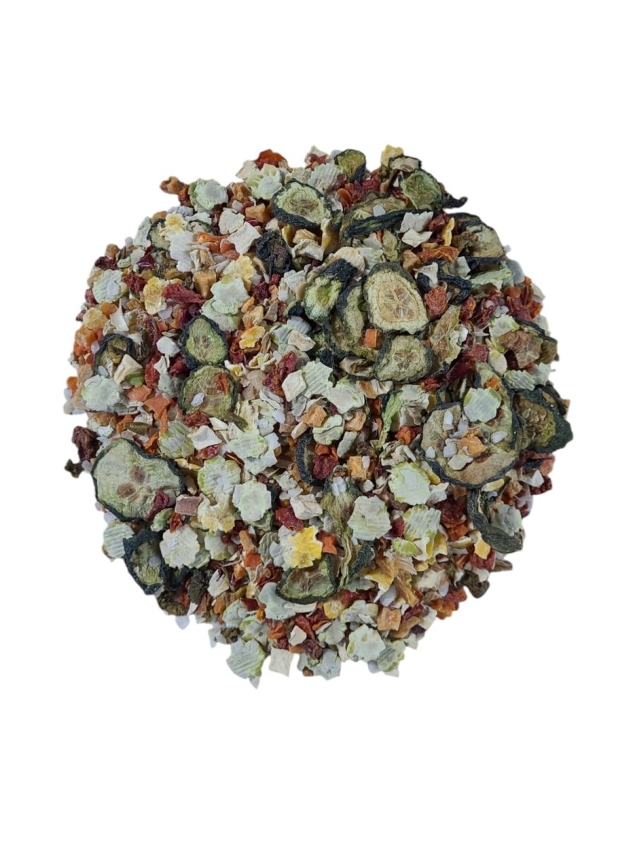 Ingrediënten: erwtenvlokken, rijstevlokken, wortel, pastinaak, zoete aardappel, komkommer, rode paprika, groene paprika, tomatenvlokken, maisvlokken.