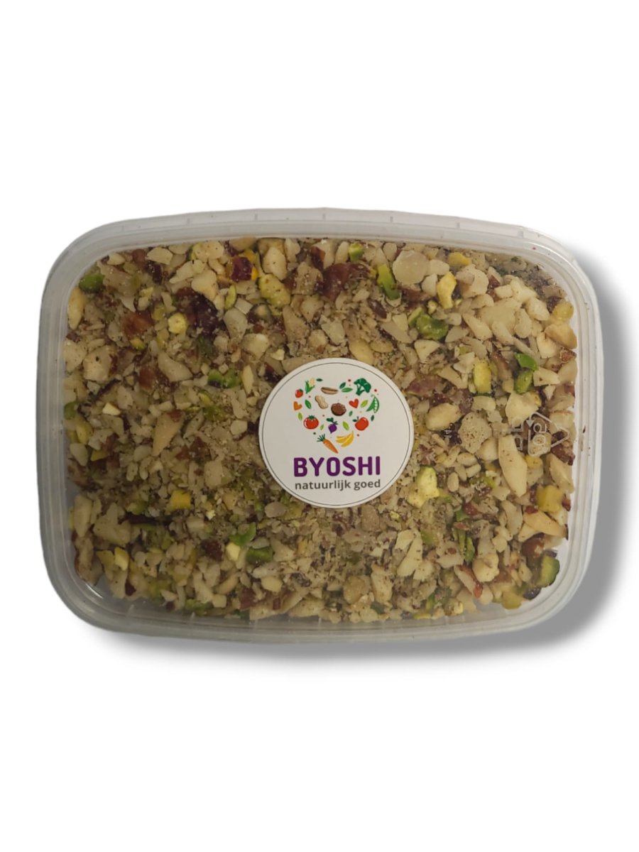 Ingredienten: Macadamia(20%), pecannoten(20%), pistache in dop(20%), hazelnoten(20%) en cashewnoten(20%).