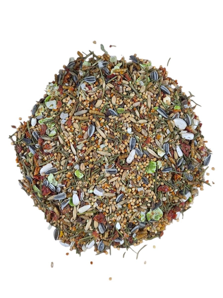 Ingrediënten: Tarwe, witzaad, zonnebloempitten, gepunte en gepelde haver, boekweit, lijnzaad, paddy, kardi, dari, hennep, peterseliestengels, gedroogde meelwormen, erwtenvlokken, gedroogde tomaat.