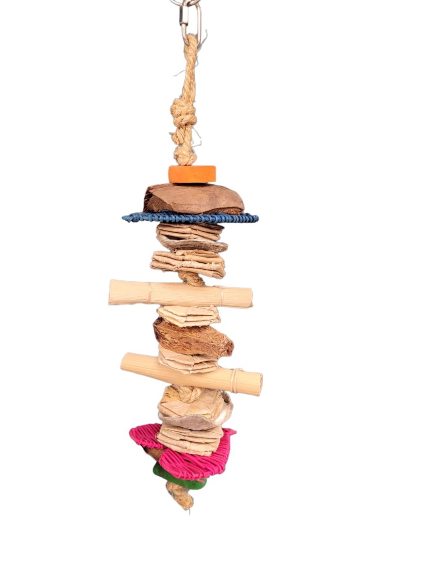 De Triple Decker is gemaakt van natuurlijke materialen zoals (java) hout, kokosnoot, bananenblad, rattan figuurtjes en bamboe. De Triple decker is volledig te slopen en dus populair onder de kromsnavels.