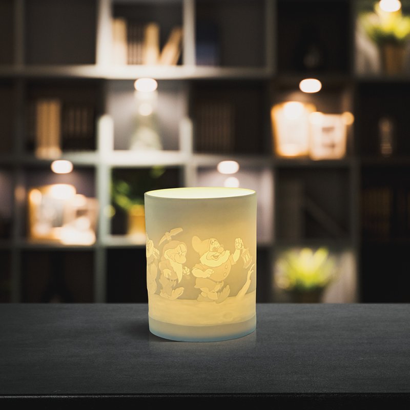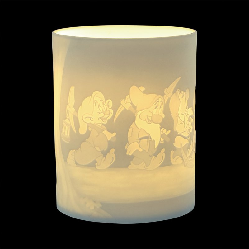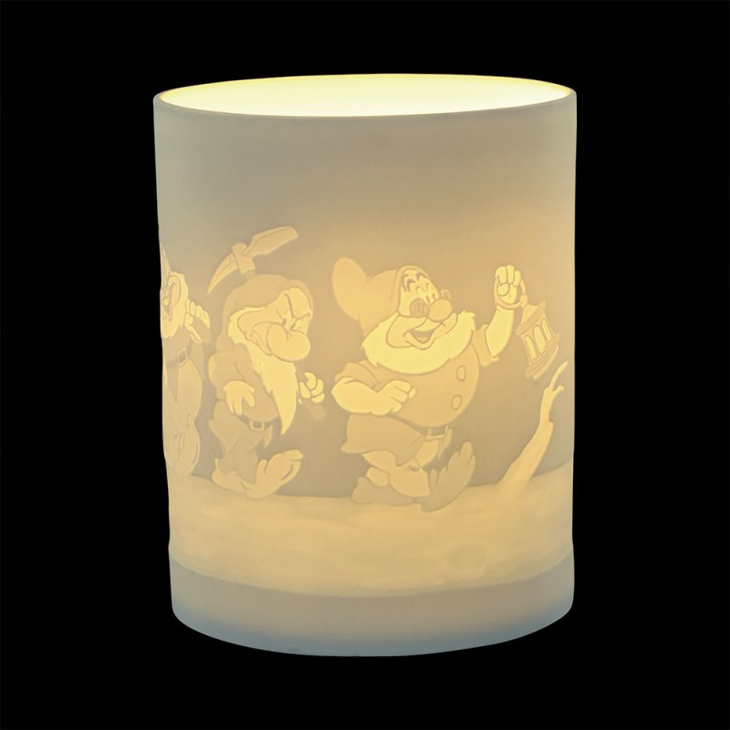 De Zeven Dwergen lijken wel thuis te komen van hun werk als je de LED-kaars aansteekt en ze door je kamer flikkeren, waardoor er een warm nachtlampje ontstaat. De Zeven Dwergen-personages uit Disney’s Sneeuwwitje zijn geëtst in het dunne doorschijnende porselein. Elektrische LED-theelichtkaars en 3 stuks LR44-batterijen inbegrepen. Theelichthouder ook geschikt voor gebruik met een kaars. Het perfecte cadeau voor elke Disney-fan.