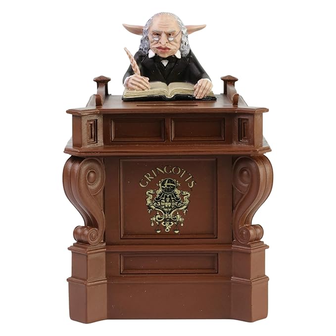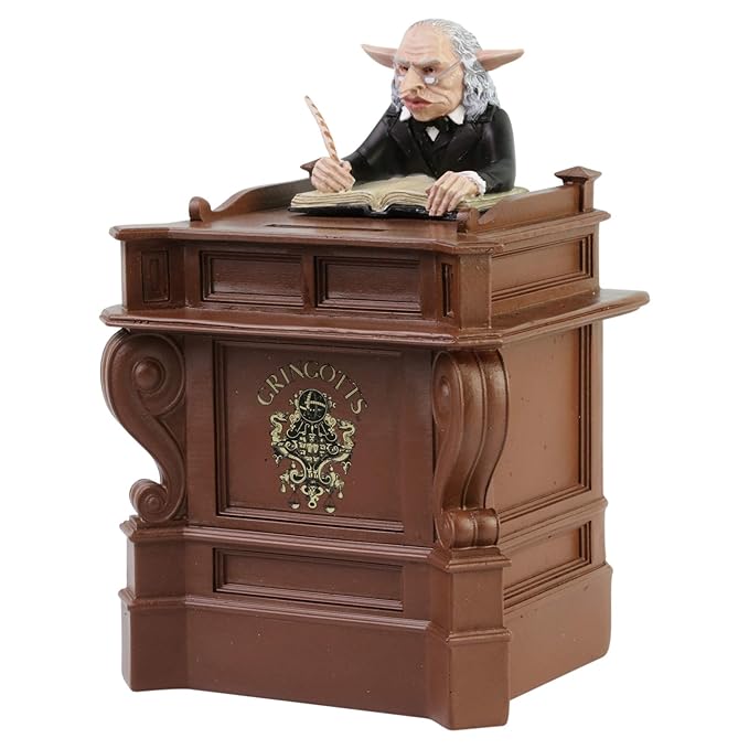 Dompel jezelf onder in de wereld van Harry potter met deze fantastische spaarpot i de vorm van een kobold van de Gringotts-bank, zittend aan zijn bureau met een pen in de hand,