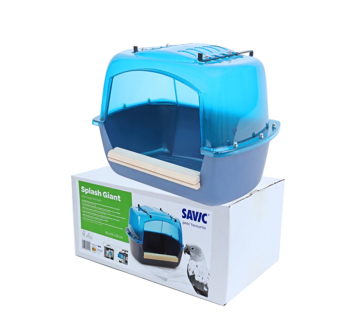 Het Savic badhuis Splash giant is speciaal ontworpen voor papegaaien. Met zijn afmetingen 38x24x28 cm is hij uitermate geschikt voor uw papegaai of andere grotere vogelsoorten. Het product kan zowel aan de binnenzijde als de buitenzijde van de kooi worden bevestigd d.m.v. de metalen bevestigingshaken aan de bovenzijde die op 2 manieren te monteren zijn. Het badhuis is ook voorzien van een grove houten zitstok aan de voorzijde die op verschillende manieren te monteren is, zodat altijd de juiste instap voor uw gevederde vriend kan worden gecreëerd. Aan de buitenzijde is het product gemonteerd met metalen schroefjes, wat de stevigheid en stabiliteit van het badhuis ten goede komt. Het badhuis zelf is gefabriceerd van dik kunststof, waardoor hij ook gemakkelijk schoon te maken is. Wordt geleverd met een lichtblauwe bovenkap en een donkerblauwe onderbak.