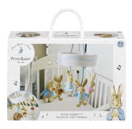 Deze prachtige muziekmobiel van Peter Rabbit toont vier personages uit de originele sprookjes van Beatrix Potter. Peter Rabbit, Flopsy Bunny, Benjamin Bunny en Cotton Tail hangen aan een ronde stoffen mobiel met de schattige tekst “Sleep tight little bunny”. Deze mobiel heeft een traditioneel opwindbaar muziekdoosje en de vier personages draaien zachtjes terwijl hij een rustgevend slaapliedje speelt. Deze mobiel is eenvoudig in elkaar te zetten en de kunststof arm kan worden versteld zodat hij stevig tussen de spijlen van het bedje past. Speelt Brahms slaapliedje