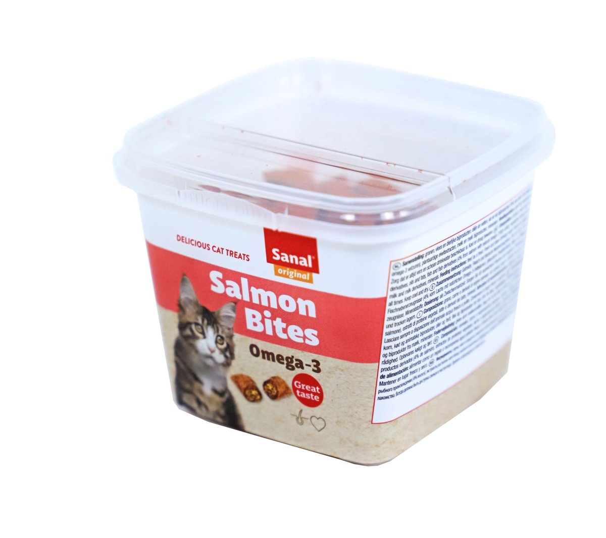 Sanal Salmon Bites is een lekkere traktatie voor uw kat. Krokant aan de buitenkant met een zachte en romige vulling van zalm. Verpakt in een handige en hersluitbare cup waardoor het product langer vers blijft.