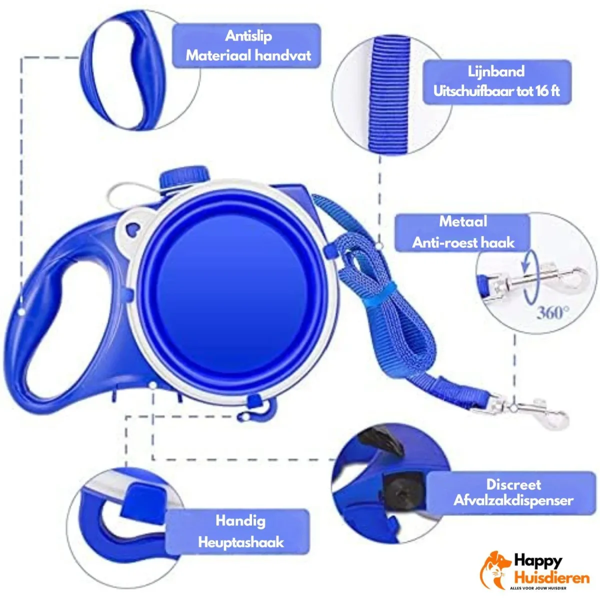 - 3-in-1 ontwerp – Combineert hondenriem, waterfles, kom en poepzakjeshouder in één handig systeem